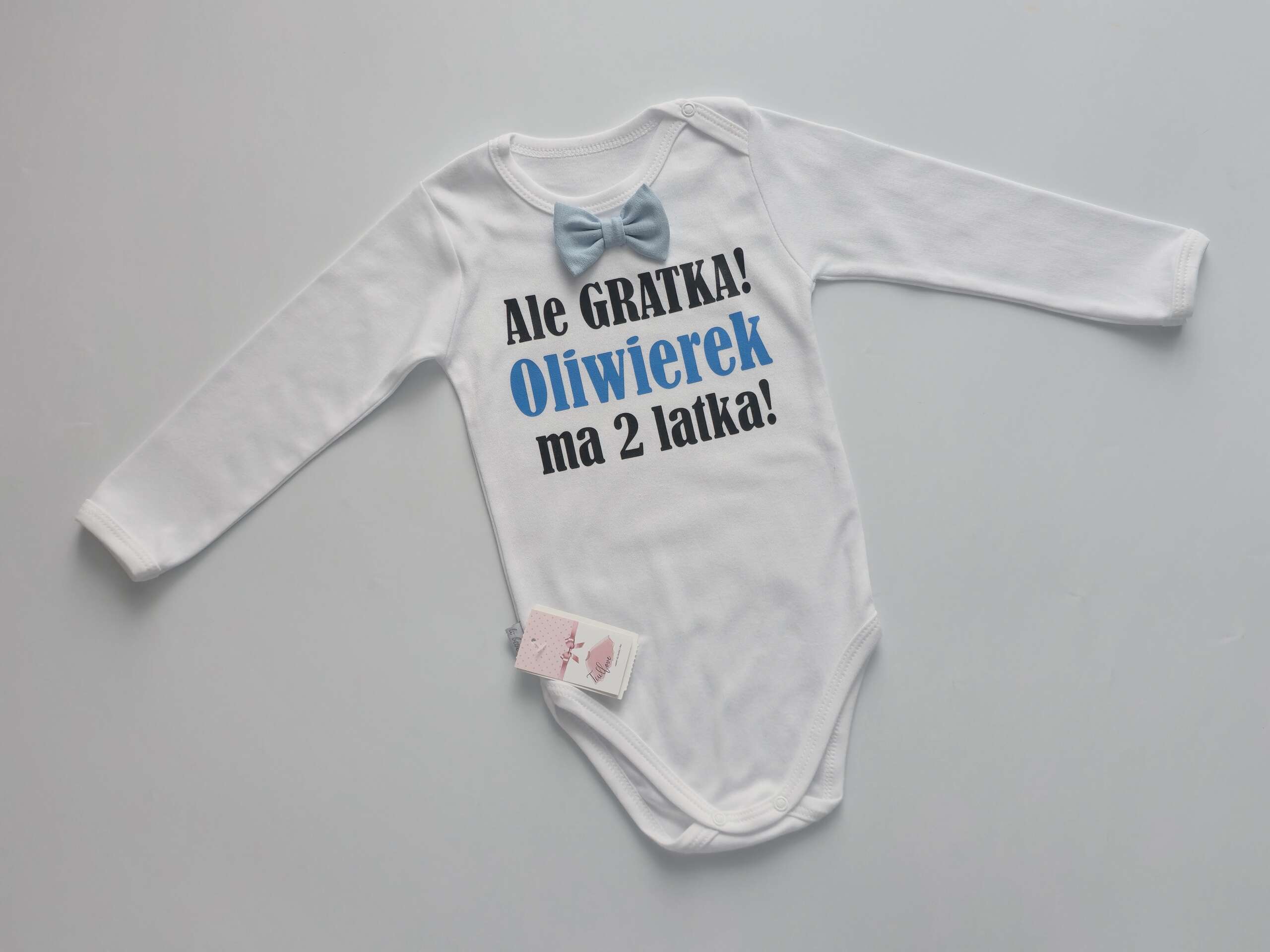 Body na drugie urodziny z błękitną muszką