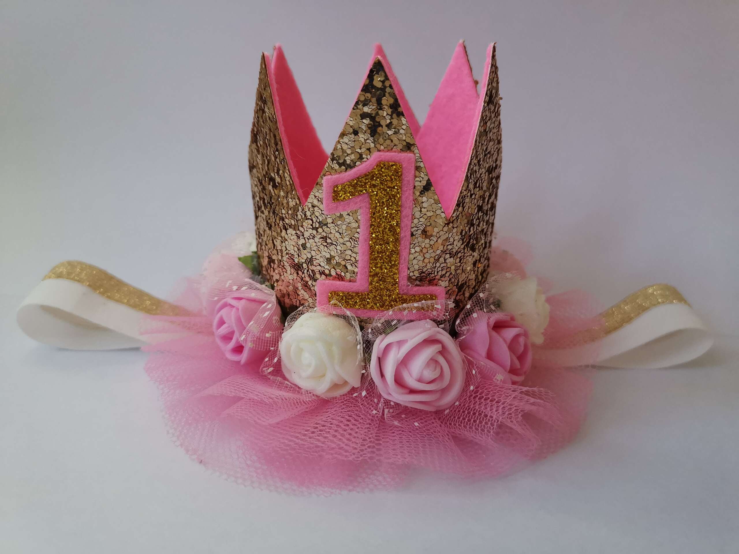 Złota korona na główkę z różowym tiulem – cyfra do wyboru